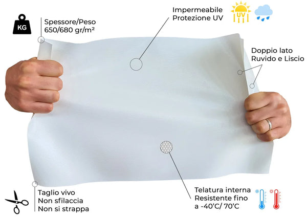 Telo unico se inferiore a larghezza 250 cm. Se la larghezza del telo richiesto supererà i 250 cm il telo sarà termosaldato con l'unione di 2 o più teli in base alle misure. Lunghezza rotolo 32 metri.
